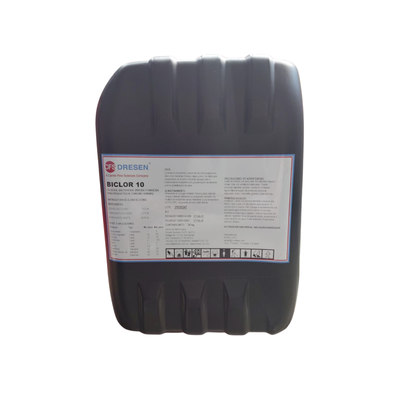Desinfectante para controlar el crecimiento y desarrollo de microorganismos tales como bacterias, hongos, algas y virus; se utiliza para el saneamiento en el ramo industrial, agropecuario e institucional, en la desinfección y preservación de alimento y en la potabilización del agua.