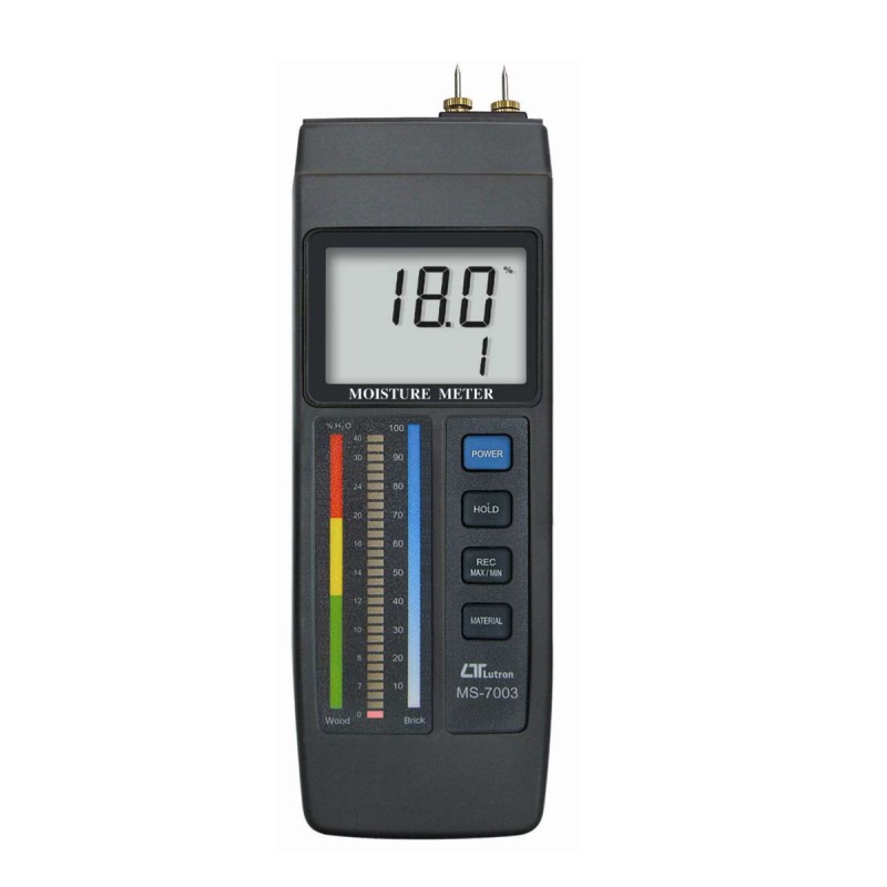 El LUTRON MS-7003 es un higrómetro digital portátil diseñado para medir de manera rápida y confiable el contenido de humedad en madera, concreto y otros materiales de construcción. Su sistema de medición por contacto mediante electrodos de dos pines permite obtener lecturas directas del porcentaje de humedad, facilitando evaluaciones precisas en campo.