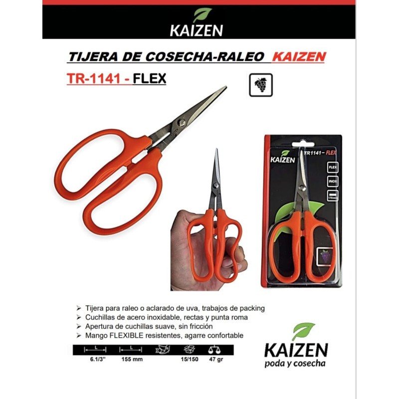 La tijera TR-1141 – FLEX de Kaizen es una herramienta manual diseñada para trabajos agrícolas de raleo y aclarado de racimos, especialmente en uvas y otros frutales, optimizando el flujo de trabajo de cosecha y packing con cortes precisos y controlados.