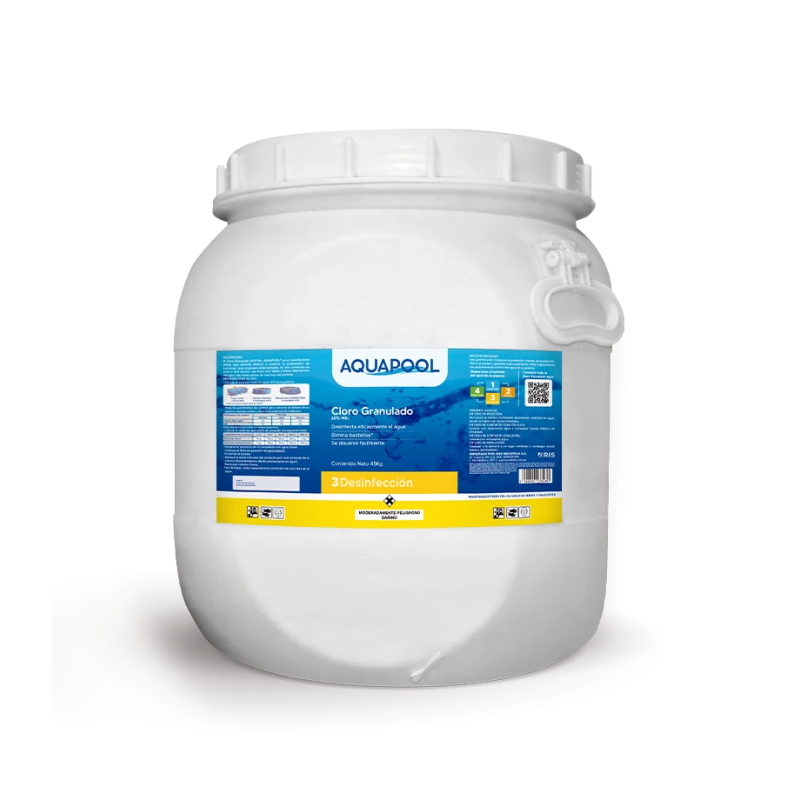 El Cloro Granulado Aquapool® es un desinfectante eficaz que permite eliminar bacterias, hongos, esporas y otros microorganismos que producen enfermedades. Su alto contenido de cloro le permite una rápida desinfección.